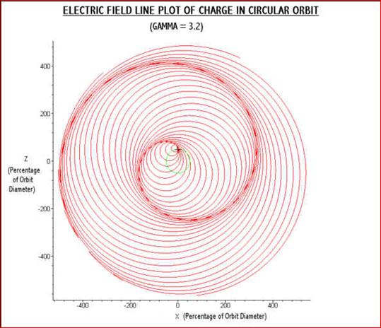 To summarise it has been shown that the gamma along the diameter provides a simple way to estimate the approximate electric field magnitude for any orbiting charge along the diameter between the charge and the orbit centre. Between the centre of the orbit and the far side the field magnitude is slightly less than that of a stationary charge although it is not in the same direction. The above plots have mainly examined the field magnitude as the field direction is easily seen from the field line plots and Fig 9. It is appreciated that the values obtained using these suggestions are only approximate but failing the availability of an exact formula they do provide an easy way to visualize and estimate the magnitude of the electric fields of a relativistic orbiting charge. Precise field amplitudes for any charge velocity can then be obtained using the Maple retarded potential program.