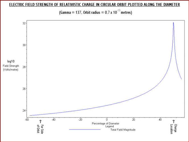 The calculation of the electric fields diametrically opposite a relativistic orbiting charge is a requirement in a number of situations. The information is contained in the above plots but field magnitudes are not easy to estimate from field line spacing. Instead the field amplitude has been calculated along a vertical line which is the diameter of the orbit. This was always done with the charge located at x=0 and z=+orbit radius, which places it at the top of the vertical diameter in the above field line drawings. The field plotted in all of this section is the total electric field, which is the sum of the charge induction and radiation fields. Errors can easily arise in calculations such as these if it is not clear in which frame the field is being calculated. All field values here are in the laboratory frame in which the moving charge is travelling in a circular orbit. The measuring line or diameter being used is stationary in the laboratory. If the measuring line were rotating at some angular velocity then entirely different field values would be obtained.