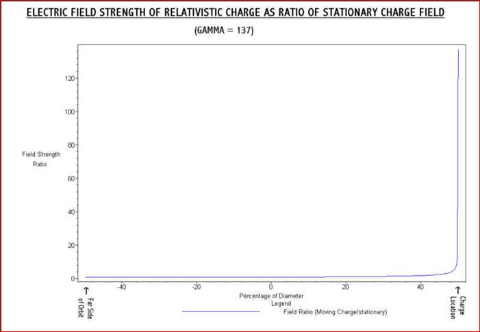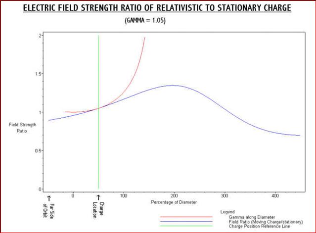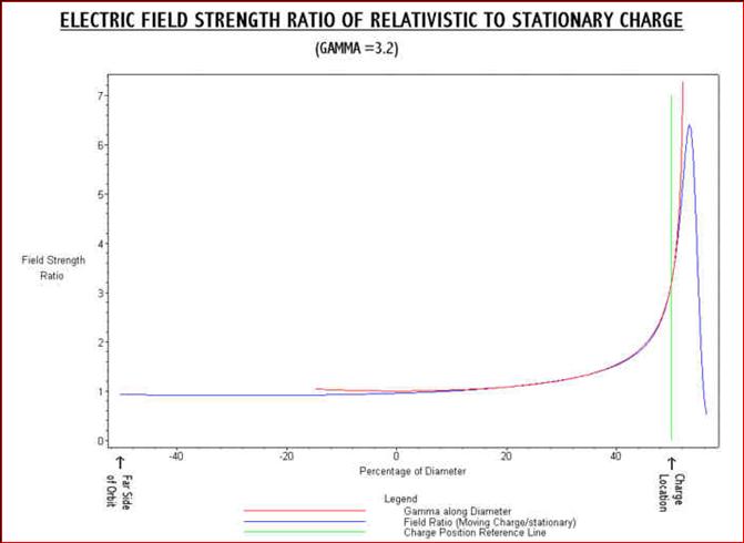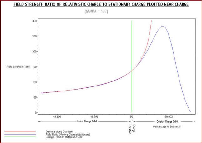 Notice how closely the blue field strength ratio line follows the red gamma along the diameter line for the part inside the charge orbit. They are so close that it is difficult to separate the two curves at this resolution. Also the field falls so fast as the measuring point moves away from the charge, inwards along the diameter, that in a distance representing only about 0.004% of the charge orbit diameter the field ratio has fallen from 137 to 70.