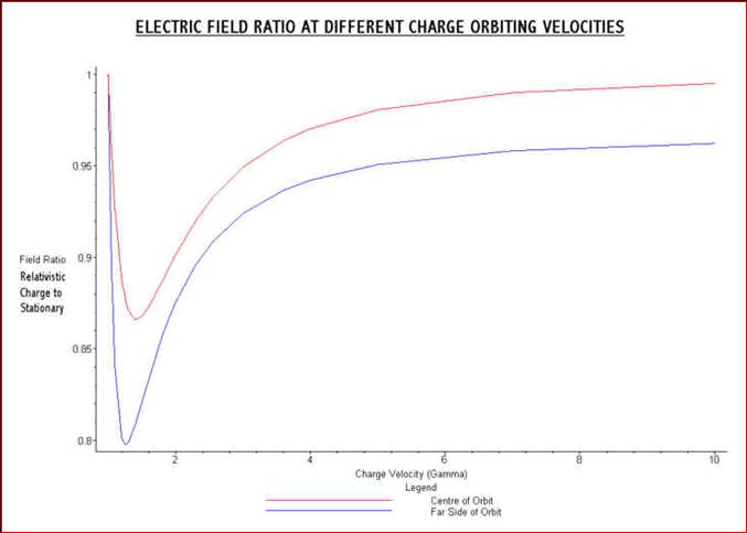 The electric field ratio has a minimum value of 0.798 at a charge gamma of 1.26 at the far side and 0.866 at a gamma of 1.41 at the centre of the orbit. For slower charge speeds than these the ratios increase again until they are, of course, both exactly unity when the charge is stationary. The ratio of 0.966 at the far side of the orbit obtained for a gamma of 137 is very nearly at a limiting value which is not exceeded at even exceptionally high gamma. The high gamma limit at the centre of the orbit is as close to one as can be calculated.