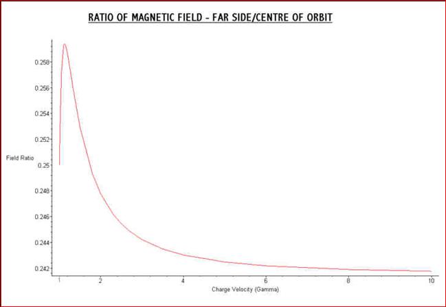 To find the way the magnetic field at the far side of the orbit changes it is convenient to express it as a ratio to the field at the centre. Expressed in this manner the far side/centre magnetic field ratio varies with gamma but is independent of the charge orbit radius. The actual field values can easily be obtained if required just by multiplying the far side/centre magnetic field ratio by the field at the centre of the orbit as calculated from the above formula. The far side/centre magnetic field ratio is:-