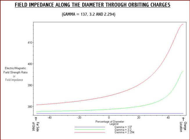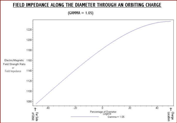 For the very high speed charge with a gamma of 137 the field impedance was calculated as 376.73 which is identical to that of free space to the accuracy quoted. It is constant at this value along the whole diameter apart from an almost imperceptible increase extremely near to the charge (It rose by only 0.01 at a distance of 1 x10-5 % of the diameter). This means that the magnetic field is falling at the same rate as the electric field. At lower velocities the field impedance is higher and rises noticeably nearer to the charge. For a gamma of only 1.05 the result is:-