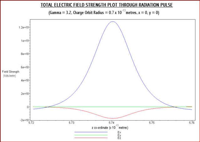 A strong band of radiation is shown at the position of the kink in the field lines which is following a spiral pattern. As the charge continues its clockwise orbit the field lines will appear to rotate with it and it can be seen that the spiral pattern indicating the radiation pulse will travel outward. This is known as synchrotron radiation. Do not be misled into thinking that there are gaps in the radiation spiral where the field is weaker. The radiation pulse spiral is continuous and uniform along the spiral. If more field lines were plotted the apparent gaps would be seen to fill in. Using the Maple program it is possible to obtain data points for the field intensity through the radiation pulse. For this purpose a particular radius must be specified as this will affect the peak field amplitude. In this case a charge orbit radius of 0.7 x 10-13 metres has been used. Taking a point directly above the charge in Fig 1 at coordinates x=0 and y=0 and z at approximately 400% of orbit diameter, the precise z coordinate range to cover the radiation pulse is found to be 5.72 to 5.76 x 10-13 metres. Plotting the total field over this range gives Fig 2 below:-
