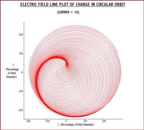 To summarise it has been shown that the gamma along the diameter provides a simple way to estimate the approximate electric field magnitude for any orbiting charge along the diameter between the charge and the orbit centre. Between the centre of the orbit and the far side the field magnitude is slightly less than that of a stationary charge although it is not in the same direction. The above plots have mainly examined the field magnitude as the field direction is easily seen from the field line plots and Fig 9. It is appreciated that the values obtained using these suggestions are only approximate but failing the availability of an exact formula they do provide an easy way to visualize and estimate the magnitude of the electric fields of a relativistic orbiting charge. Precise field amplitudes for any charge velocity can then be obtained using the Maple retarded potential program.