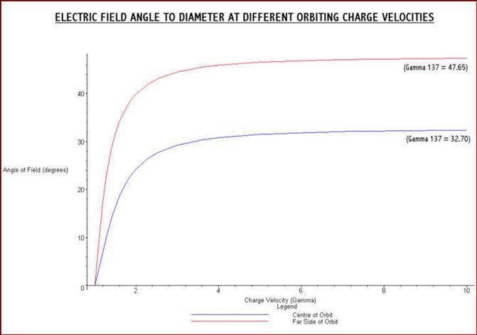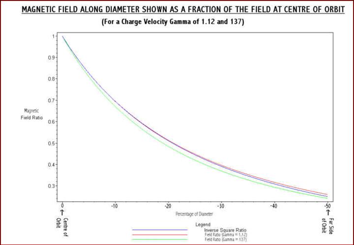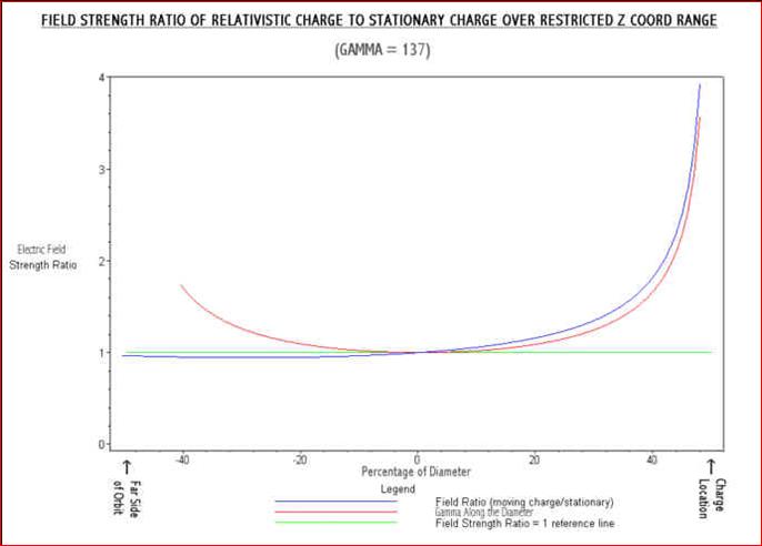 Notice how closely the blue field strength ratio line follows the red gamma along the diameter line for the part inside the charge orbit. They are so close that it is difficult to separate the two curves at this resolution. Also the field falls so fast as the measuring point moves away from the charge, inwards along the diameter, that in a distance representing only about 0.004% of the charge orbit diameter the field ratio has fallen from 137 to 70.