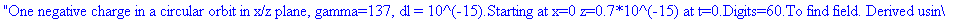 > details:="One negative charge in a circular orbit in x/z plane, gamma=137, dl = 10^(-15).Starting at x=0 z=0.7*10^(-15) at t=0.Digits=60.To find field. Derived using emfieldcalc2.mws"; ***Alter as appropriate.